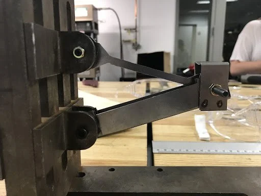 The design consists of three pieces manufactured with 1018 Steel. Two pieces make up the actual bracket (members BC and AC) and one piece is a cap placed on top of connection point C, distributing the force applied along the cross section of the members. Before manufacturing, we ensure that our sheet of steel is at least a size of 130 x 65 mm. Steps for manufacturing include: cutting steel pieces, bending, welding, a second round of cutting and shaving, drilling holes, and the final assembly. As the project progressed, we found key issues in tolerances created by human error were resulting in unsatisfactory results.