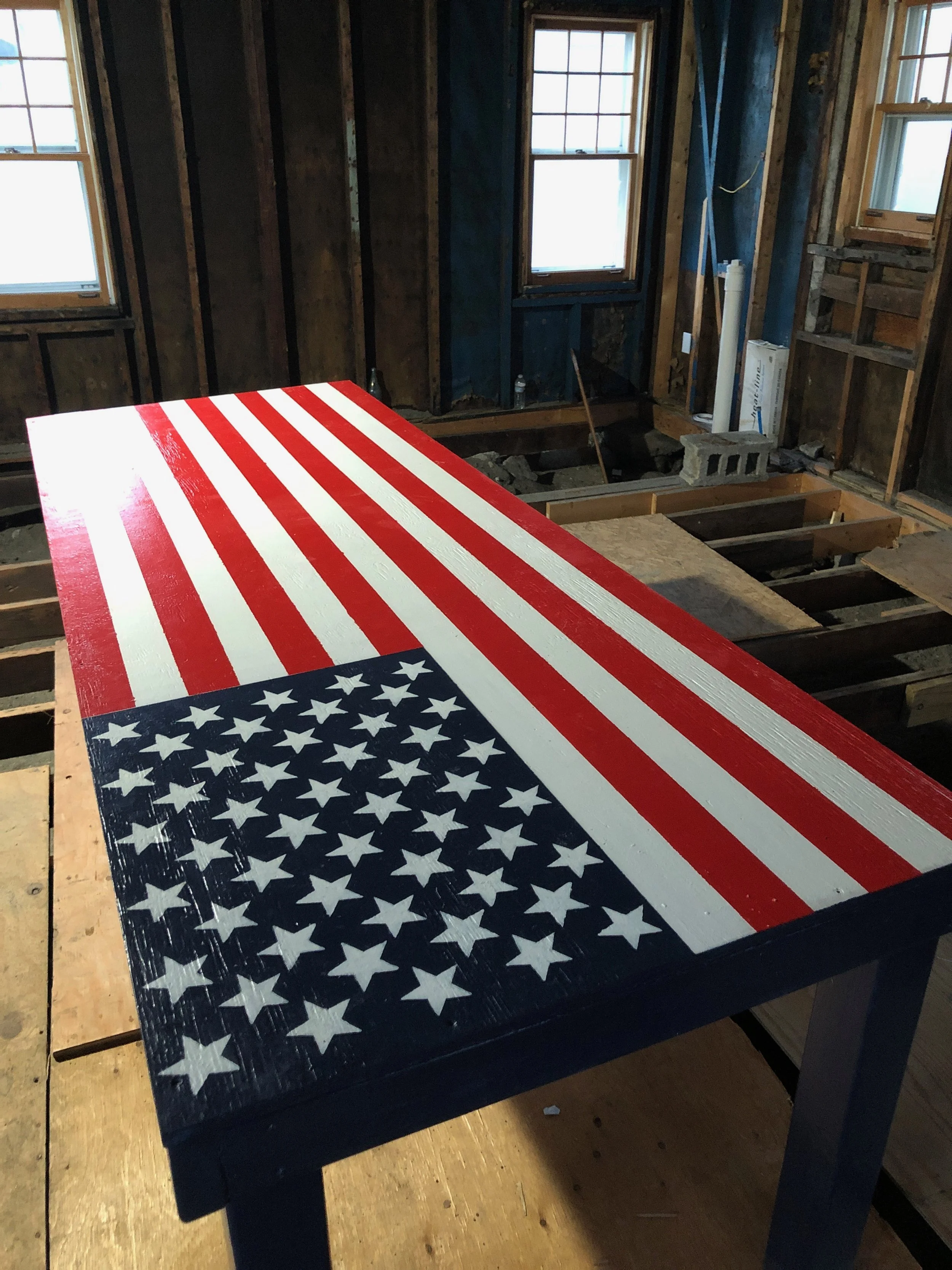 After a layer of primer, painting began. I measured and taped off areas for the stripes, and made a stencil for the stars. After painting was finished, I applied 2 coats of polyurethane to protect the table from water, sand, and food, drinks, or games happening on the surface. Several years later, the table is still in use today and receives complements from beachgoers every Independence Day.
