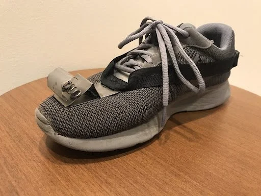 After trying several prototypes involving visual and auditory cues, we found the patient responded best to auditory stimuli. As such, we designed a noisemaking insert that fit under the laces of a shoe to alert the patient when he was kicking a stair. We selected for features like cost, comfort, ease of use, and ease of manufacturability. The prototype was hand made using sheet metal, with individual pieces welded of glued together.